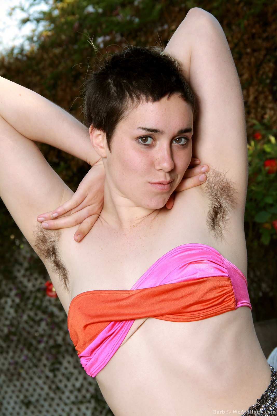 Barb in We Are Hairy set Barb spreads her pale legs outside